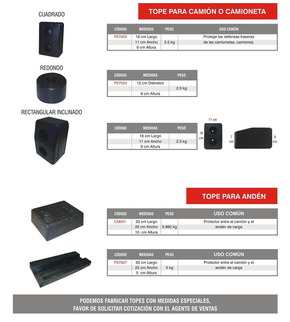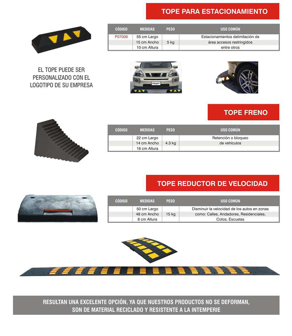 El tope de estacionamiento residencial  se utiliza para guiar a los vehículos en el momento de estacionarse en lugares reducidos, protegiendo de esta manera el frente del automóvil, así como los muros y columnas. El tope permite estacionarse sin preocupaciones en garajes o cocheras. En México tiene una garantía de 2 años en materiales y uno en la cinta.